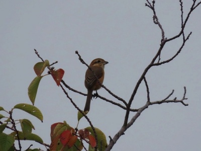 曇りで蒸し暑い日でした。集合した公園では、サクラの葉が紅葉し始めており、サンゴジュの実も赤くなっていました。木の枝にモズがとまっています。シジュウカラやムクドリの声も聞こえます。