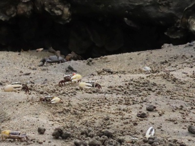 和白川の砂洲では、ハクセンシオマネキの白い大きなハサミがいくつも見えました。河口までの脇の畑に、サツマイモのピンクの花が畝一面に沢山咲いていて、珍しい光景でした。