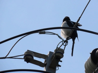 嘴がピンク色に近い色をしていました。魚を捕まえて、ちょっと苦心して飲み込みました。いつもは沖にいるので、こんなに近くでしっかり観察でき感動しました。電線上のカササギも、近くで観察できました。