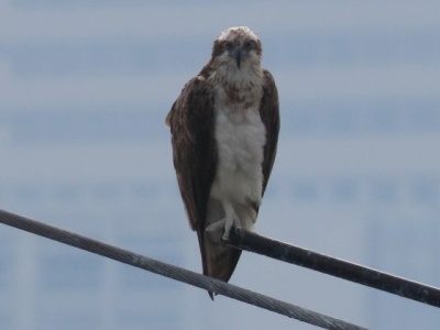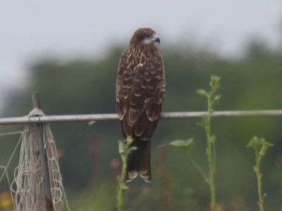 鉄塔の下にミヤコドリやダイシャクシギ、ホウロクシギがいました。突然、ミヤコドリの声がして、バラバラに動きだすと、目の前を鳥が横切りました。ハヤブサです。シギなどの上を飛んだ後、鉄塔にとまりました。