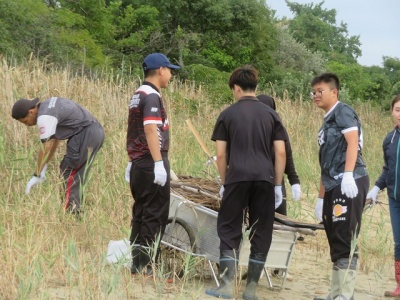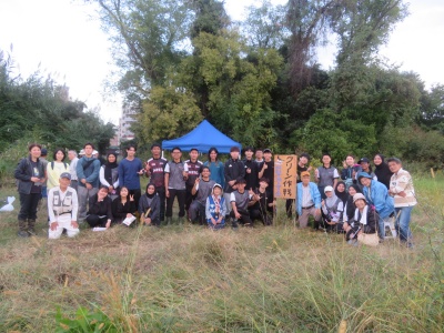 清掃を始める前にテントを張って準備しました。今回のクリーン作戦には、北九州の九州工業大学にマレーシアより短期留学の学生20名を2名の先生が引率して来られました。