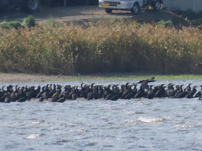 唐原川河口付近にカワウの1000羽もの大群がいて、休んだり暴れたりしています。カモたちはオナガガモとヒドリガモが多かったです。他のカモたちはまだ多くは来ていません。