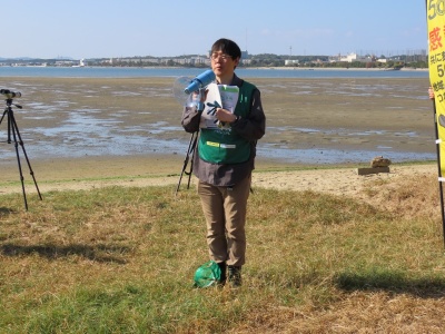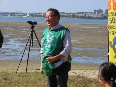 守る会の山本代表の挨拶で、今年はいつも清掃で回収して頂いているアオサが真夏の猛暑で少ないため自然ゴミ・人工ゴミのゴミ拾いのお願いをしました。続いてダンロップの代表お二方からの挨拶があり観察会が始まりました。