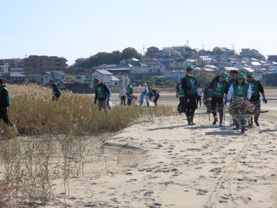 それから、アシ原で打ち寄せた木の枝等の自然ゴミを中心に、一輪車やリヤカーを使って回収しました。福岡市がプラスティックごみを未だ可燃ごみとしていることに数名の方が驚かれていました。皆さん積極的にたくさん回収していただきました。