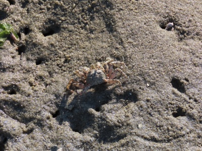 アオサや、オゴノリ、ボウアオノリ、貝では珍しく大き目のソトオリガイが見つかりました。帰り際にもう一度コメツキガニの巣穴を探しましたが、やっとコメツキガニを1匹だけ見つけることができ紹介しました。