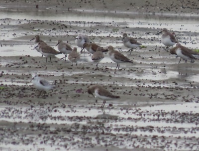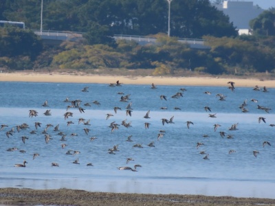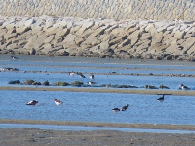 観察された鳥:ミヤコドリ、ハマシギ約110、シロチドリ30、ミユビシギ、ミサゴ2、ホウロクシギ1、ダイシャクシギ1、コサギ1、マガモ、ヒドリガモ、オナガガモ、スズガモ、カンムリカイツブリ、ホオジロガモ