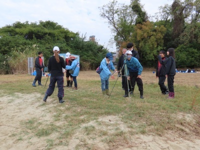 砂洲へ移動して、小さい丸い巣穴を掘ってコメツキガニを探しました。穴の掘り方を皆さんに教えながらコメツキガニの姿を観察しました。カニの巣穴はたくさんあって、甲幅1センチ程の大人のカニが多く見られました。
