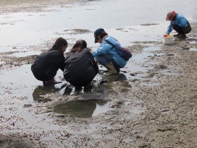 次に干潟に入りコメツキガニの巣穴を探しましたが、寒かったためか、残念ながら全くありませんでした。代わりに干潟の上にはいろんな鳥たちの足跡が沢山ありました。少しずつ沖に向かい二枚貝を集めました。
