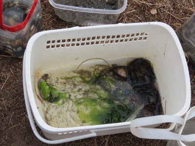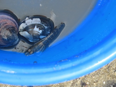 今回は海の広場沖でもアサリが多く見つかり、オキシジミも数個取れました。ウミニナの浄化実験の為のウミニナを拾いましたがヤドカリが多く、浄化実験の為のウミニナの数を確保するのが大変でした。