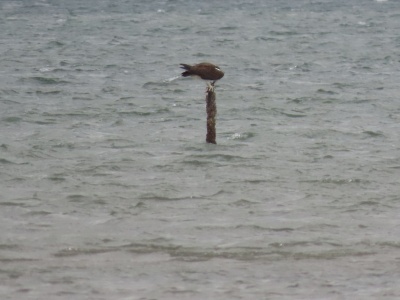 棒杭の上でミサゴが魚を食べていました。岸辺にはハマボウの木がたくさん大きく育っており、葉が黄色く色づいていました。岸辺をハクセキレイが先導するように何羽も飛びました。