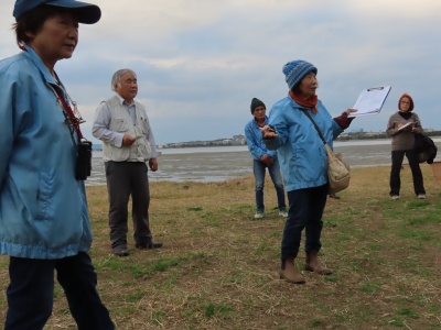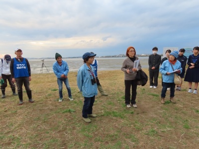 海の広場まで行くと、唐原川河口付近にヨシガモやヒドリガモの群れが見えました。あまりにも寒いためか、林の中でメジロやウグイスなどの声は聞こえませんでした。