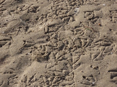 潮が引いてカモ達は沖の方にいましたが、干潟の生き物たちは寒いので砂に潜り、干潟の上にはカモ達の足跡が沢山ありました。ミヤコドリやツクシガモは、まだたくさんいて、見ることができます。