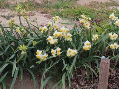 風避けの木や草のある和白川河口に行きました。和白川河口の奥まったところにマガモやヒドリガモやオオバンなどがいました。畑側にはスイセンの花が咲いていて、きれいでした。