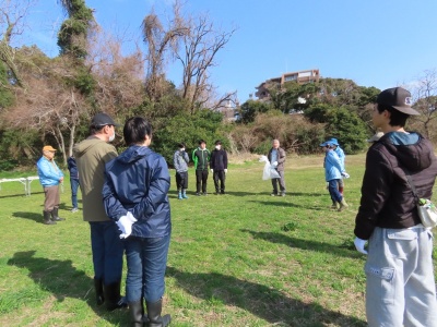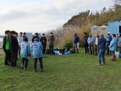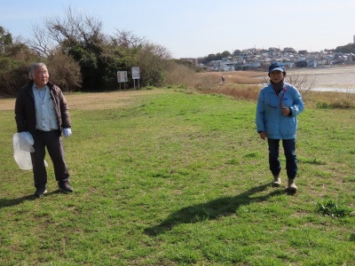 朝は薄曇りでしたがクリーン作戦が始まる頃には晴れて暖かくなり、風が強くなりました。最初にゴミ回収の説明をしてから始めました。先日からの強い風で、唐原川河口付近のアシ原には人工ゴミが沢山ありました。