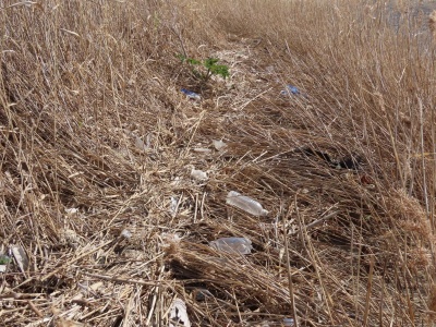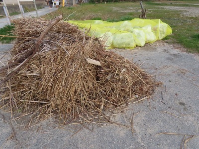 又、事前に周辺の人工ごみを拾ってくださった方があり、海の広場前は比較的綺麗でした。アシ原入口より唐原川河口付近までの広範囲に、アシの上に打ち上げられて被さった草木類が沢山ありました。